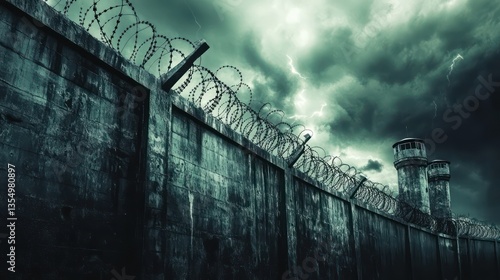 © nur, Fototapeta premium Dark Stormy Wall Barbed Wire Fence