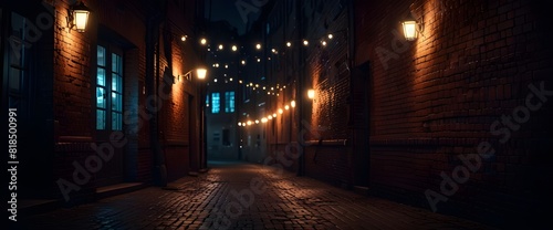© Mudassir, Fototapeta premium Dark street, old brick wall decorated with night lanterns. Empty street scene, neon light. Night view, blurred abstract bokeh light.