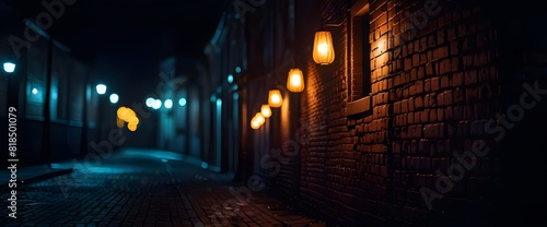 © Mudassir, Fototapeta premium Dark street, old brick wall decorated with night lanterns. Empty street scene, neon light. Night view, blurred abstract bokeh light.
