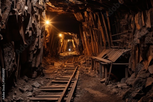 Fototapeta premium Dark subterranean tunnel showing historical mining industry infrastructure...