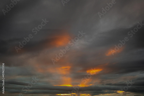 © mark_gusev, Obraz premium Dark sunrise sky with warm orange rays of light. Nature background