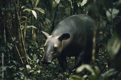 Fototapeta premium Dark tapir hidden rainforest foliage.