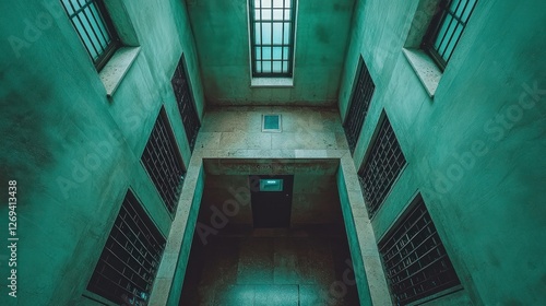 © andi, Obraz premium Dark teal building interior, high-angle view, central door, barred windows, design