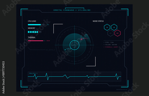 © Meico Studio, Obraz premium Dark Teal Sci Fi HUD Interface Infinity Radar Heartbeat Work Status Panel Flat Vector UI Template Illustration Design