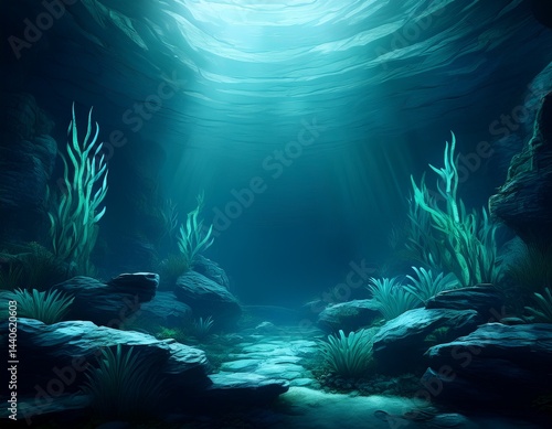 © Enrique, Fototapeta premium dark teal underwater 3d illustration rocks frame a mysterious dimly lit deep ocean scene with subtle aquatic plants at the base