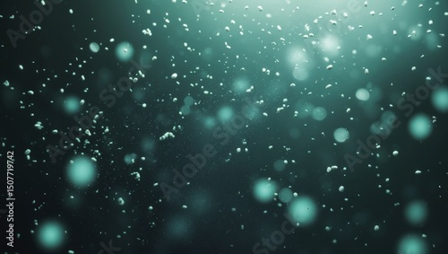 © Svetlana, Fototapeta premium Dark textured background with a subtle grain effect, floating digital particles scattered across the scene, mostly in soft aqua green and light white , creating a futuristic dust effect