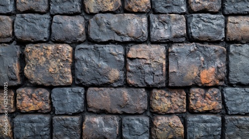 Fototapeta premium Dark, textured cobblestone pavement pattern, outdoor background