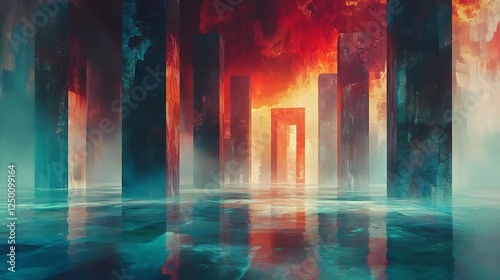 © heinng, Fototapeta premium Dark towers reflect in glowing teal water creating a surreal fiery cityscape. AI Generated