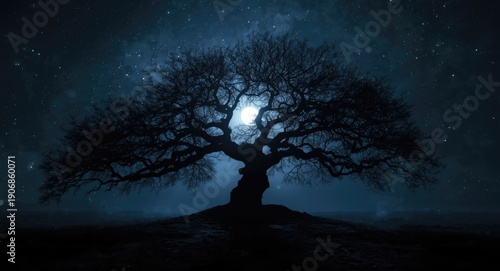 © vxnaghiyev, Fototapeta premium dark tree shape highlighted against a luminous moon and cosmic glow