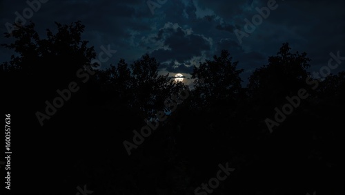 Fototapeta premium Dark trees silhouetted against a large moon on a gloomy night
