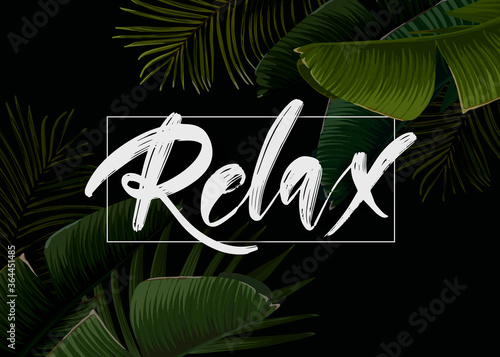 © Ms.Moloko, Fototapeta premium Dark tropical summer design with banana palm leaves, glowing frame and space for text. Vector flyer, banner or card template. Summer vector background.