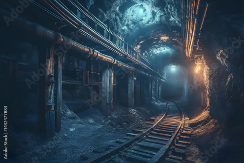 © Isra, Naklejka premium Dark Tunnel, Rail Tracks, Deep Mine