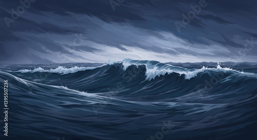 Fototapeta premium Dark, turbulent ocean waves crashing under a stormy sky, evoking a sense of...