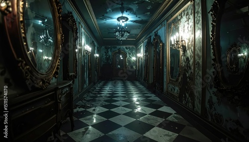 Fototapeta premium Dark Twisted Funhouse with Distorted Mirrors and Unsettling Atmosphere