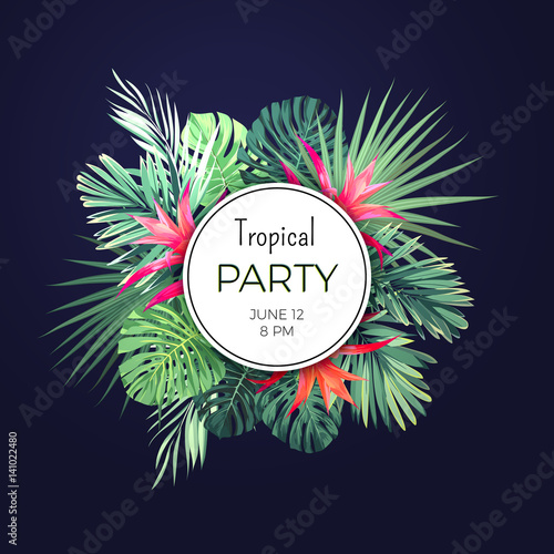 © Ms.Moloko, Naklejka premium Dark vector floral banner template for summer beach party. Tropical flyer with green exotic plants and red flowers.