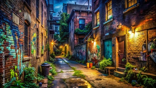 © Danicha, Fototapeta premium Dark Vintage Urban Alleyway Backyard Graffiti, Grunge Wall, Brick, Shadow, Night