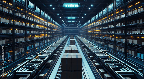 © superlovetravel, Obraz premium Dark warehouse for parcels storage