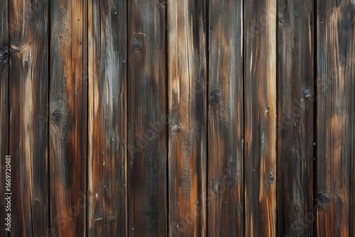 Naklejka premium Dark, weathered wooden planks in a rustic setting.