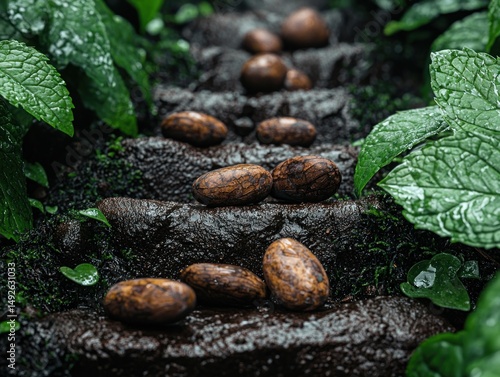 Obraz premium Dark, wet steps in lush jungle, with cocoa beans