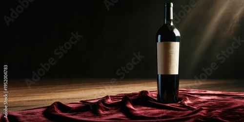 Fototapeta premium Dark wine bottle rests upon draped fabric. Dramatic lighting creates shadows, highlighting rich textures, elegant presentation.