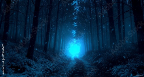 Obraz premium Dark Winter Forest Path with Falling Snow and Ethereal Light