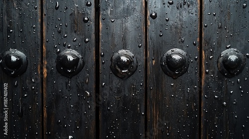 © Gufis, Obraz premium Dark wood planks with water droplets and metal studs.
