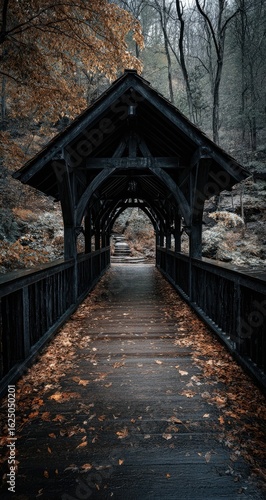 Fototapeta premium Dark, wooden footbridge arching through a misty forest