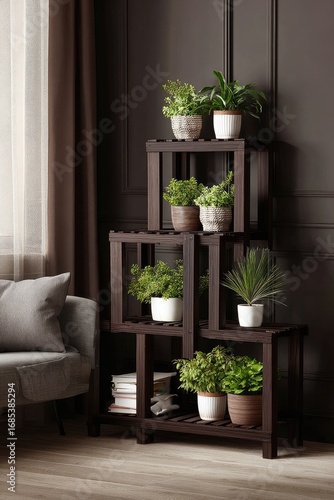 © Yani, Fototapeta premium Dark wooden plant stand with multiple tiers and potted greenery accents a modern living room.