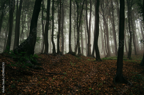 © andreiuc88, Obraz premium dark woods background, autumn forest landscape