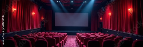© Nong, Fototapeta premium Darkened cinema hall with worn velvet curtains and flickering projector light , grunge, projector, atmosphere
