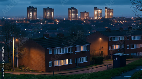 Obraz premium Darkened homes contrasting lit buildings in urban landscape, symbolizing...