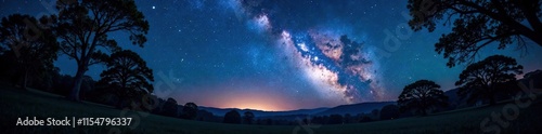 © vilavanh, Fototapeta premium Darkened landscape under starry night sky with Milky Way arch shining through branches of trees, shadow, branches, darkness