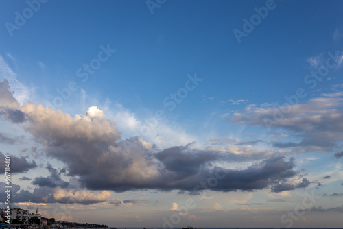 © vuralyavas, Obraz premium Darker dramatic clouds and sunlight beams at blue sky, capture from seaside