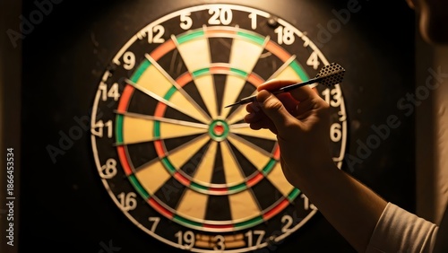 © Роман Соловьев, Obraz premium Dartboard competition perspective showing dart in hand ready to throw with focus on bullseye scoring target