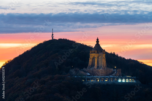 © Joel Wüstehube, Obraz premium Das Kaiser Wilhelm Denkmal bei Sonnenuntergang, Porta Westfalica, Deutschland