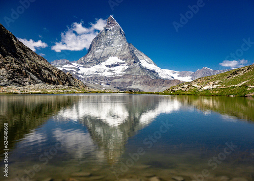 Naklejka premium Das Materhorn (4478 m ü. M.) am Riffelsee in der Schweiz, wo er an der Wasseroberfläche gespiegelt wird. Es ist einer der höchsten Berge der Alpen einer der bekanntesten Berge der Welt.