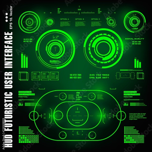 © PALERM089, Obraz premium Dashboard display virtual reality technology screen. HUD futuristic green user interface, target
