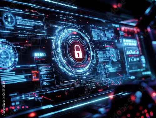 Fototapeta premium dashboard, security, technology, network, futuristic, interface, innovation, future, control, smart. digital padlock icon, cyber security network and data protection technology on dashboard HUD.