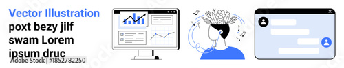 Obraz premium Data analysis, creative thinking, digital communication, information sharing, virtual connections, tech solutions. Graphs on a screen, brain with music chat interface. Data analysis and creative