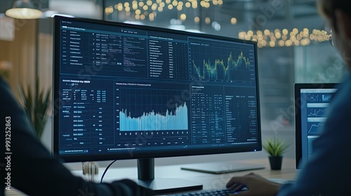 Fototapeta premium Data Analysis on Dual Monitors in Modern Office Setting