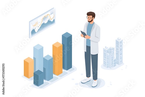 © Humanology, Fototapeta premium data analyst standing with glowing bar charts and machine learning curves around, professional AI startup theme, 3d animation, isolated on a white background