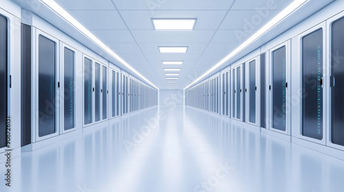 Obraz premium Data center aisle with bright data lines and server units, clean background,...