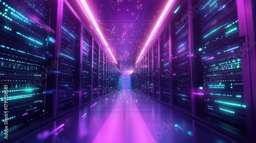 Fototapeta premium Data center corridor with glowing server racks and network data