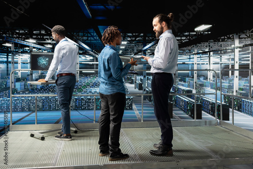 © DC Studio, Obraz premium Data center engineers team performing maintenance on supercomputers with artificial intelligence. Server room staff members upgrading rigs used for machine learning, software engineering.