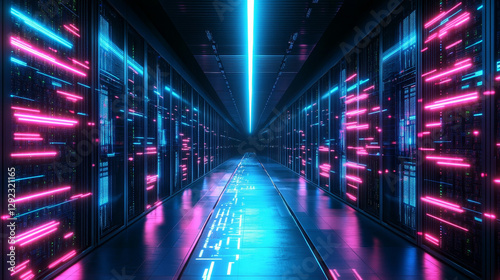 Fototapeta premium Data center room tunnel with neon blue and pink light glow. Realistic 3d...