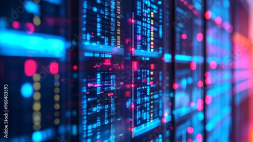 Fototapeta premium Data Center Server Racks With Neon Lights and Bokeh