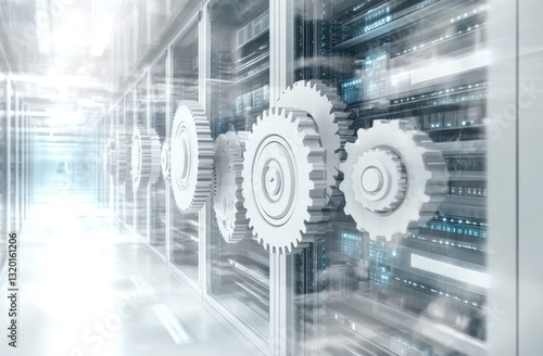 © malayeka, Obraz premium Data center server room with gears depicting network processing and efficiency.