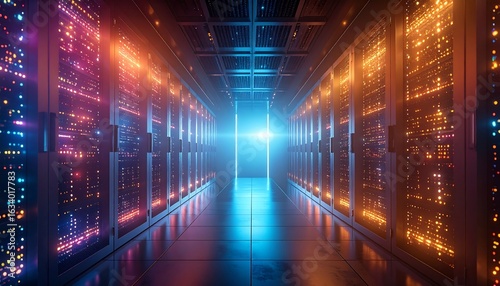 Fototapeta premium Data Center Servers Glowing with Light in Dark Room