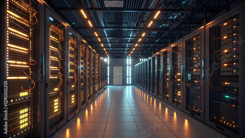 © stockbyazan, Fototapeta premium Data Center with Illuminated Server Racks