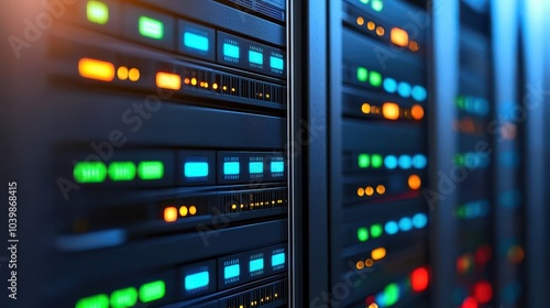 Fototapeta premium Data center with illuminated servers, blue and orange lights, abstract perspective.